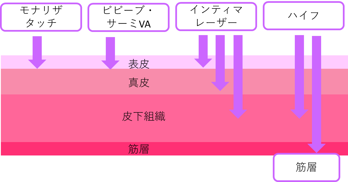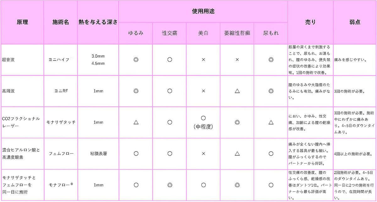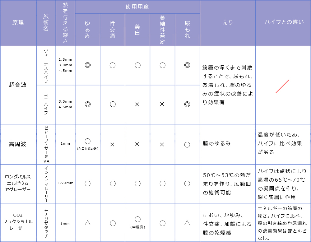 当院ではヨニハイフ(yoni HIFU)を使用しています。ヨニハイフでは照射ラインを増やし、点ではなく面で照射するため、一回の治療で実感できるタイトニング効果が格段に違います。そのため、従来のマシンより少ない治療回数と短時間の治療で効果を実感していただけます。